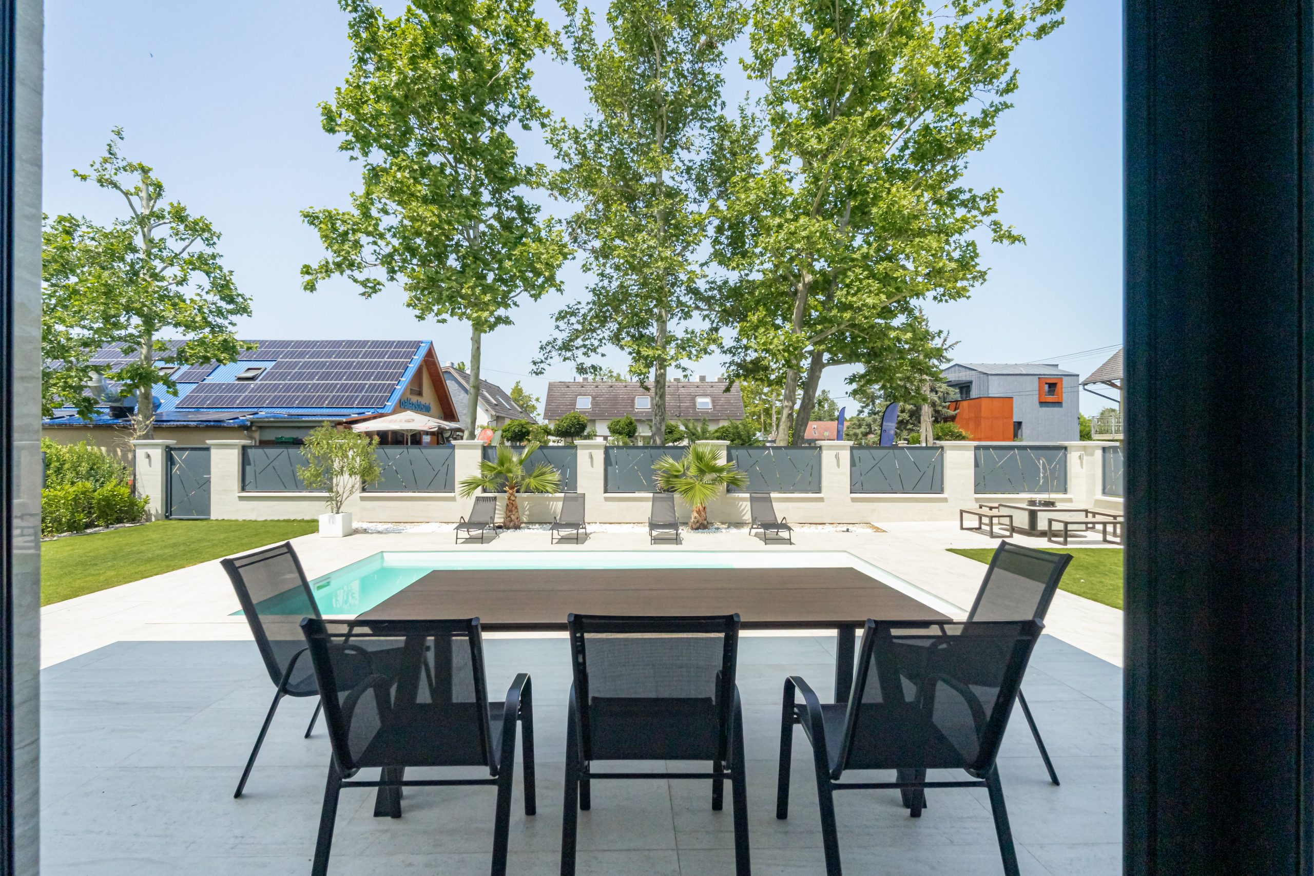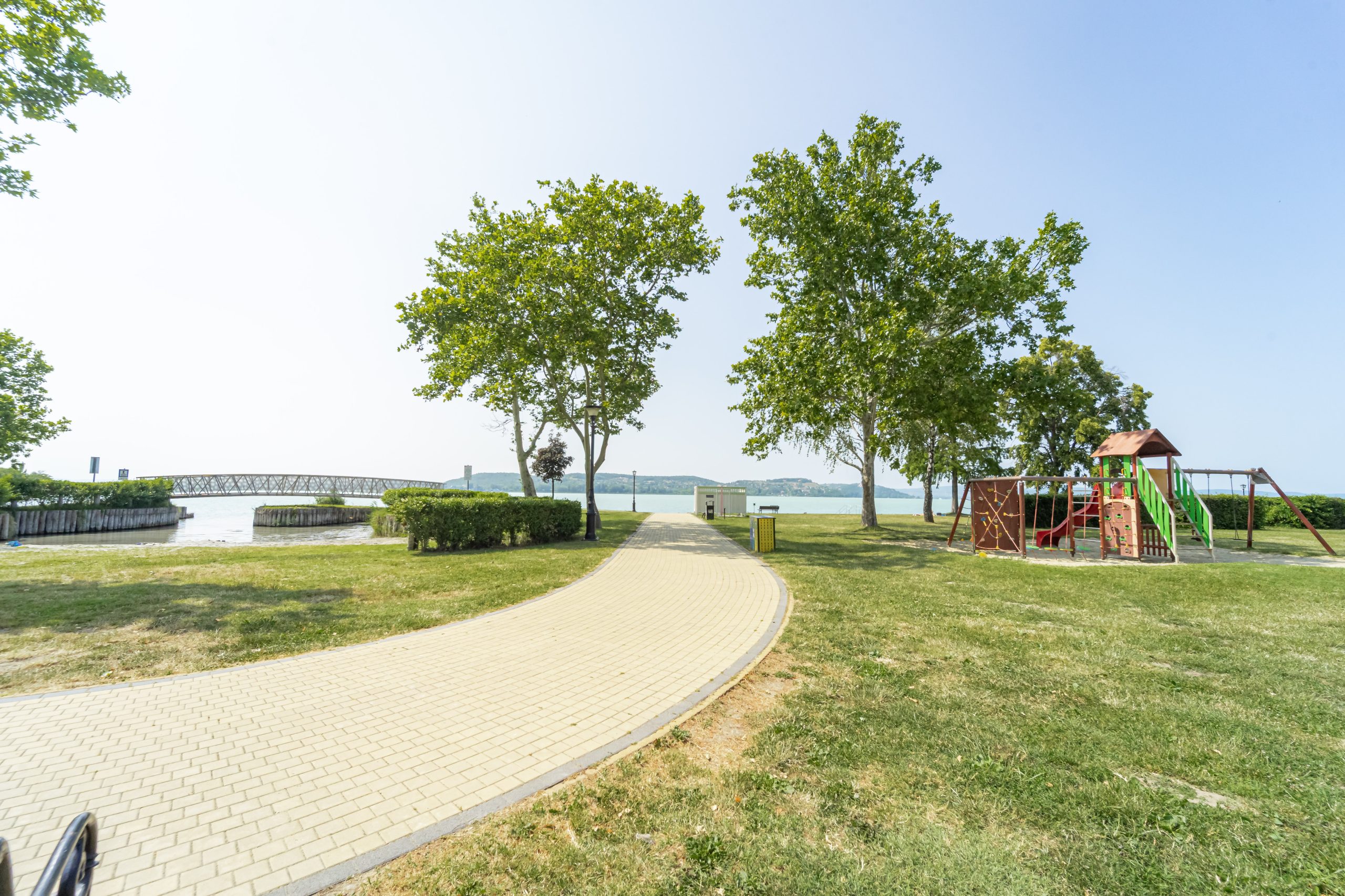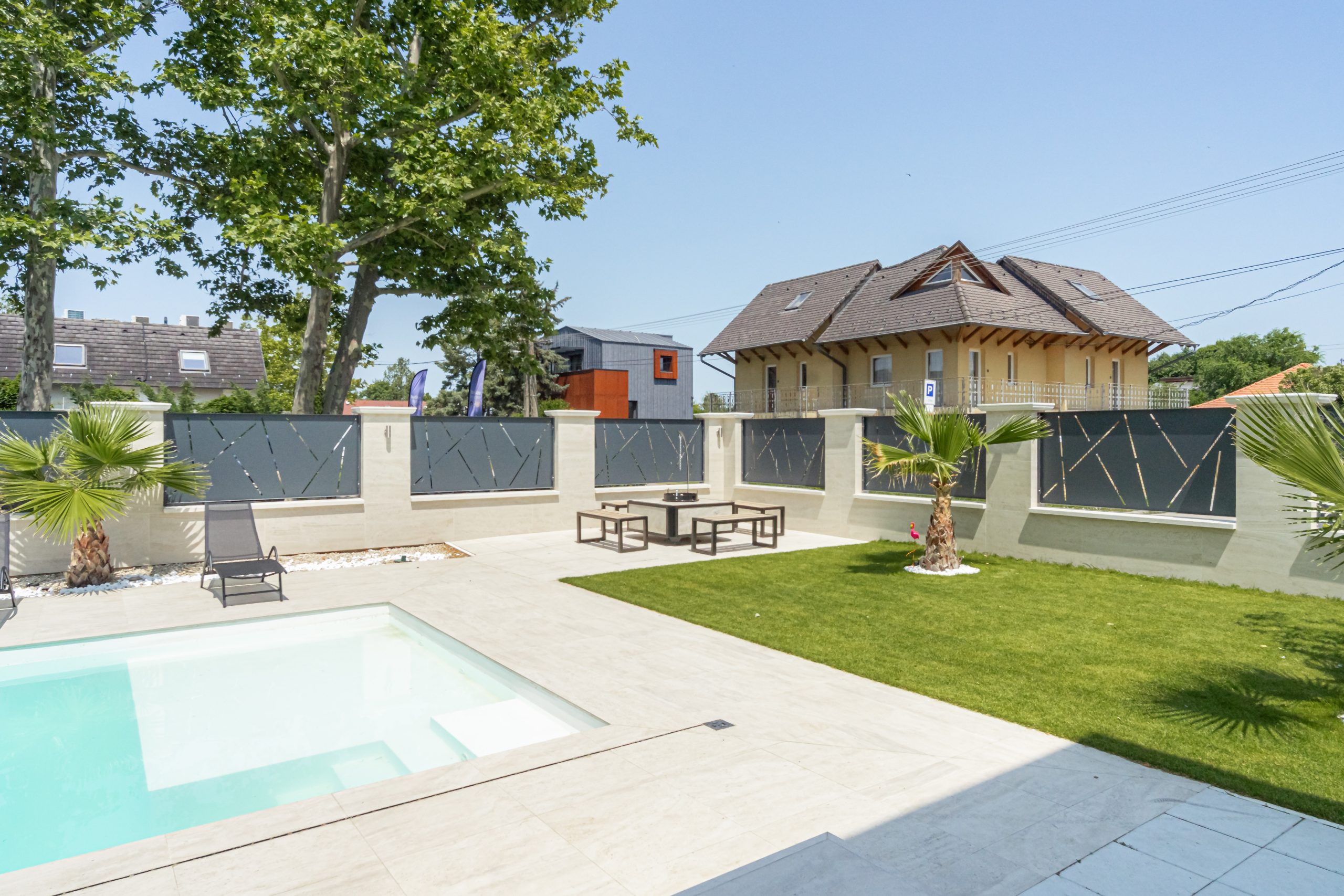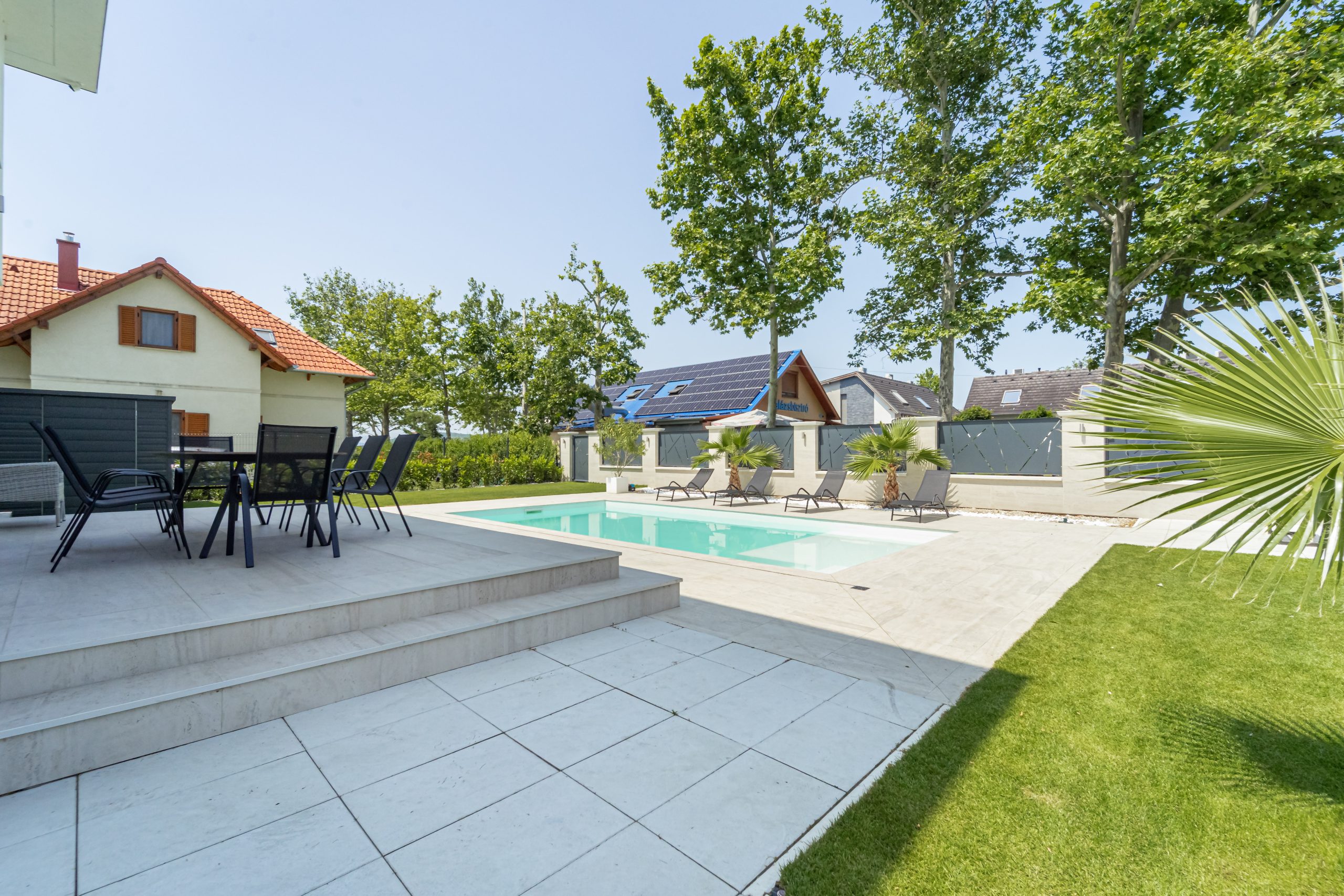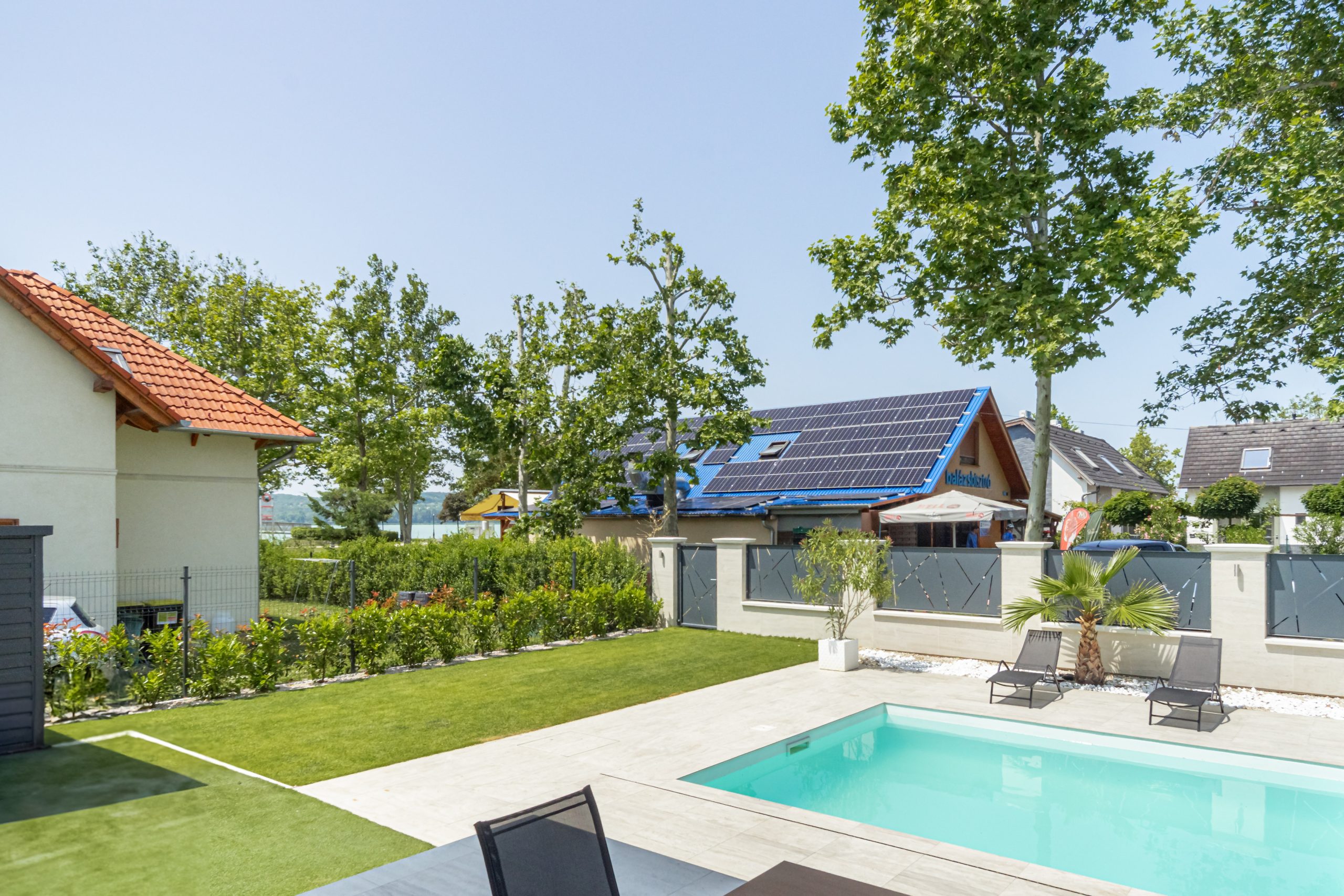 Beautiful, brand new Villa, 1 minute walk from Lake Balaton, the garden is extremely sophisticated and well-kept. Palm trees provide a Mediterranean atmosphere. The holiday home is absolute luxury inside and out. The living room is spacious and bright. There is a very nice view of Lake Balaton from the terrace. When the owner handed over the cottage, he showed everything